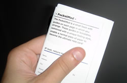 The PocketMod is a new way to keep yourself organized. Lets face it, PDAs are too expensive and cumbersome, and organizers are bulky and hard to carry around. Nothing beats a folded up piece of paper. That is until now. With the PocketMod, you can carry around the days notes, keep them organized in any way you wish, then easily transfer the notes to your PDA, spreadsheet, or planner.