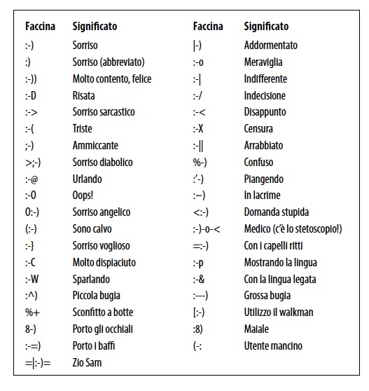 Non esiste un vero dizionario standard per gli smileys. Gli smileys in uso sono tantissimi, ma quelli di più frequente utilizzo non sono poi molti e sono riportati nella tabella sotto.